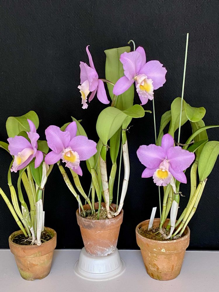 今年の元日に投稿した花(中央)と、バックバルブから育てた2鉢が、咲きそろいました。