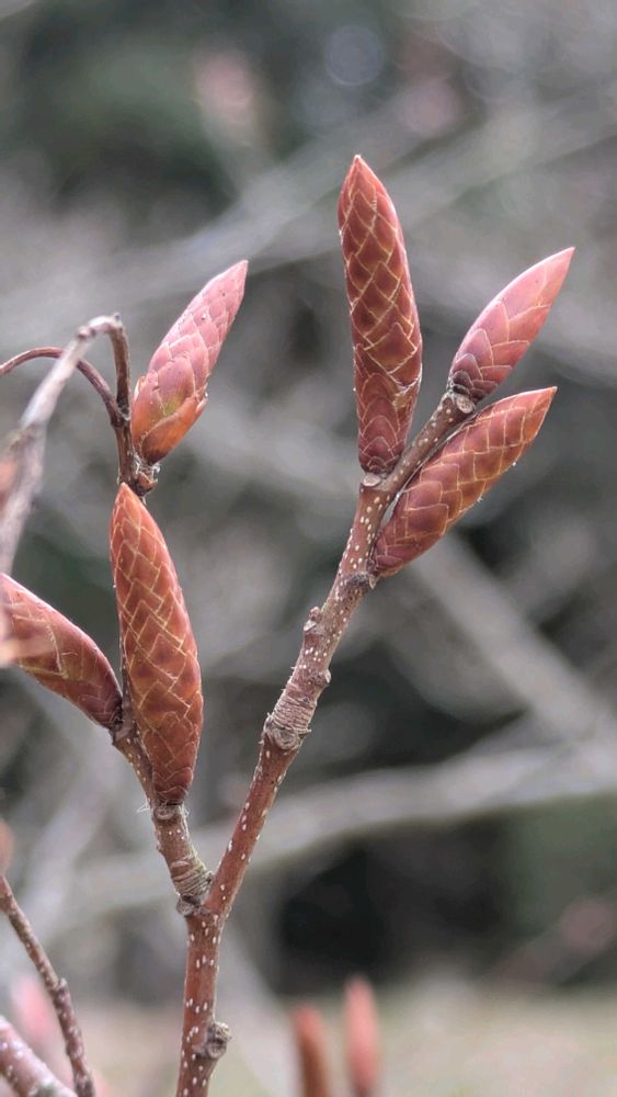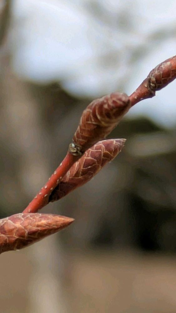 太い冬芽は雄花芽で、細い冬芽は葉芽、あるいは葉と雌花の混芽といわれている🔴芽鱗は今はしっかりと閉じていて、これが春に緩んで来るのも楽しい⭕🟢
