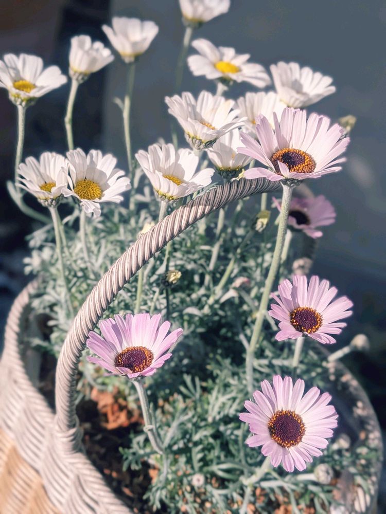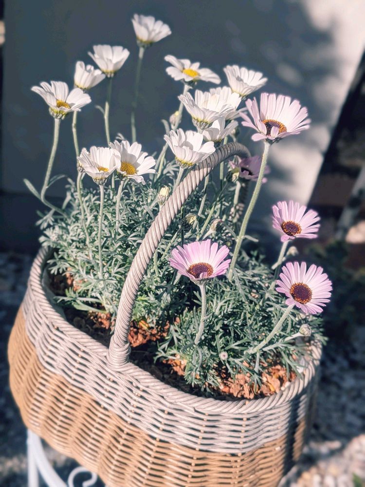 待機苗だったローダンセマム エルフピンクとエルフホワイト、昨日行った園芸店で一目惚れしたツートンカラーのカゴに植え付けてみました😄