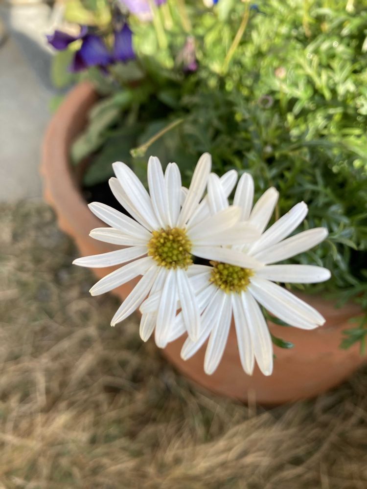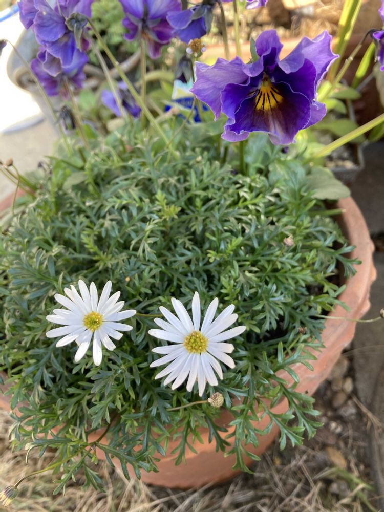 フレアブルー💜💙に合わせて🤍のブラキカムを寄せ植えしています。強健なので、今朝でもシャキン!