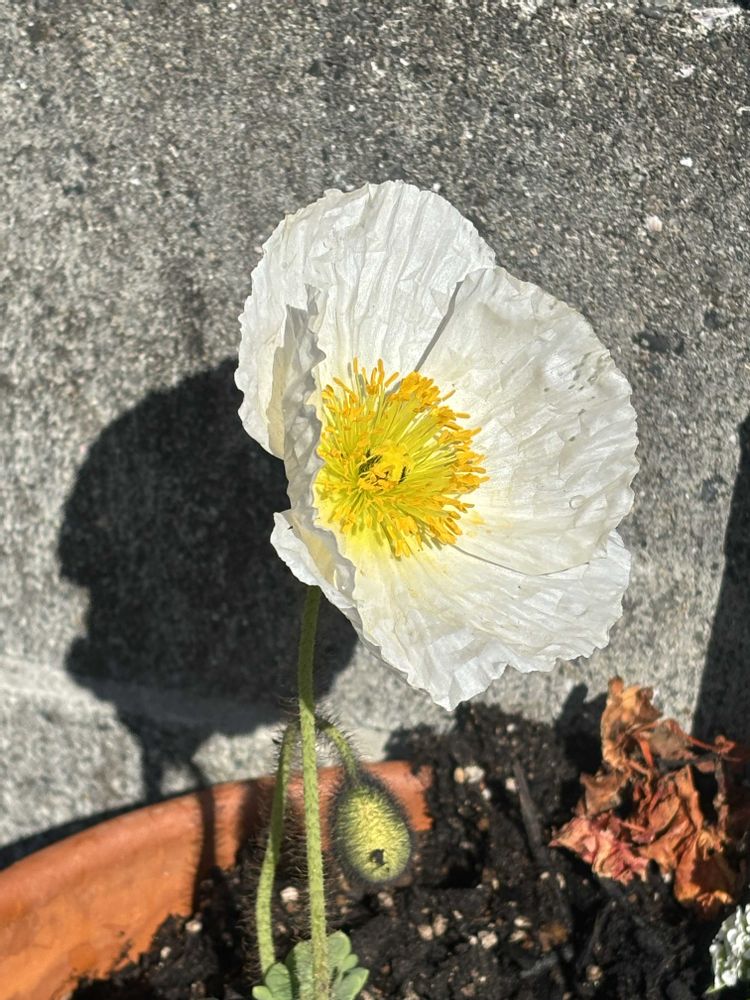 大家さんちのポピー?真っ白で綺麗でした 昨日も咲いていて 散歩から帰ってきたら切り取られてたから なくなる前にパチリ 毎日咲くのかなぁ まだ蕾があります