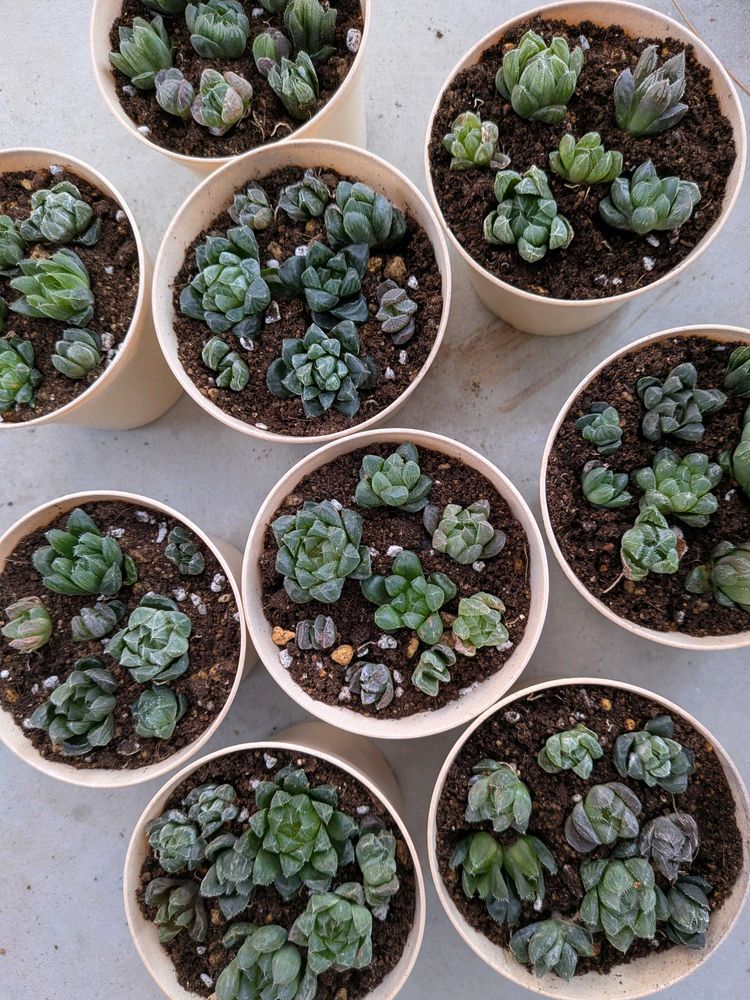 先日、ほむらさんからお譲りいただいたハオルチアの苗の植え付けが完了しました〜✨自家交配の斑入りの選抜落ちの斑なしの苗をたくさん送ってくださいました❤鉢の色を揃えました、モリモリにそだちますようにーー✨