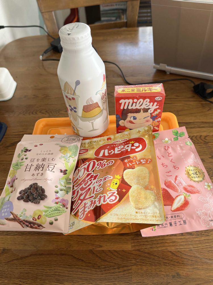 ②③ハッピーターンの大きなケースに、お菓子やドリンク