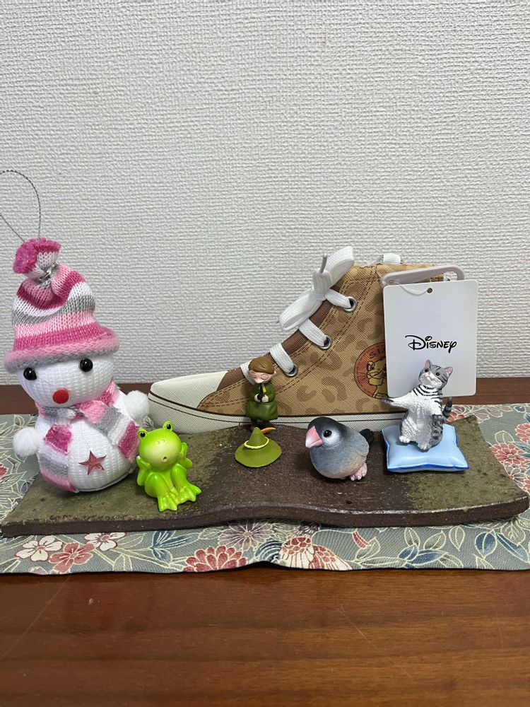 ④様々なお祭りに使えるようにと、左から、雪だるま、まったり🐸、スナフキン、オカメインコ、ネコちゃん、後ろは、スニーカーのお財布です。