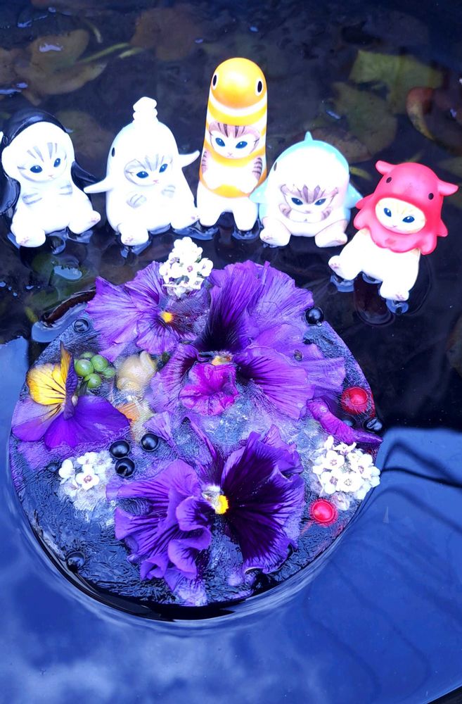 ③枚目…庭にお花を散らしたお水を置いておいたら…氷アートが出来ました~😆💕✨💙💜❤️
