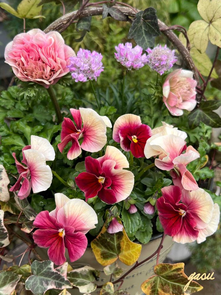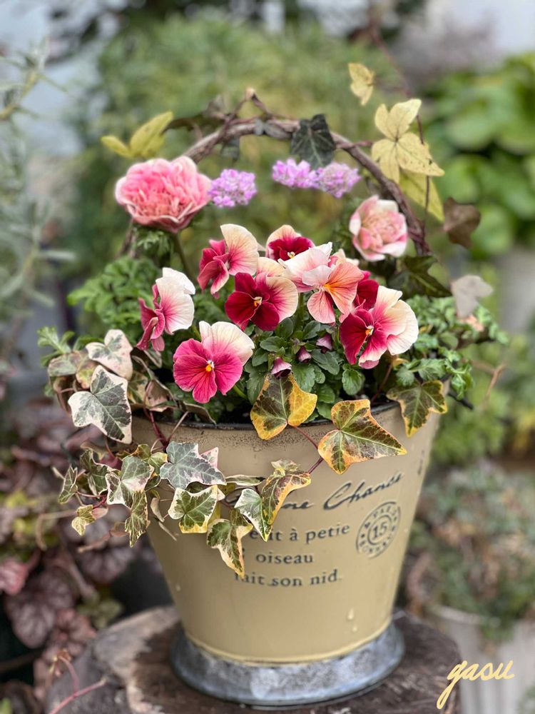 この時期花が少ないので寄せ植えは小さな庭のようで良いですよね😊