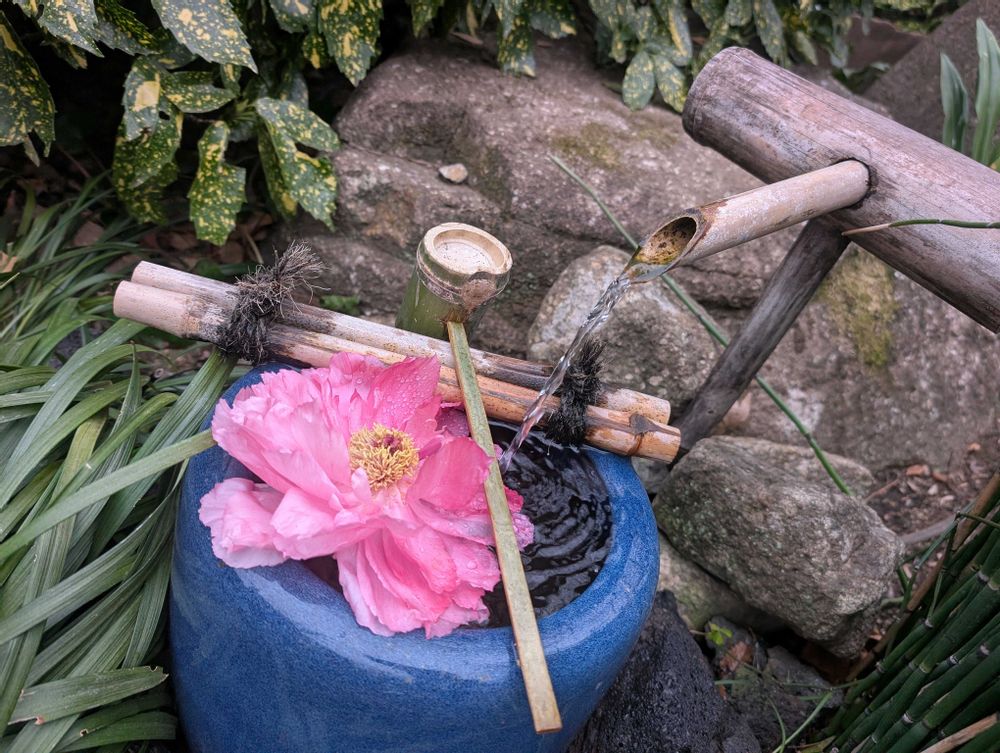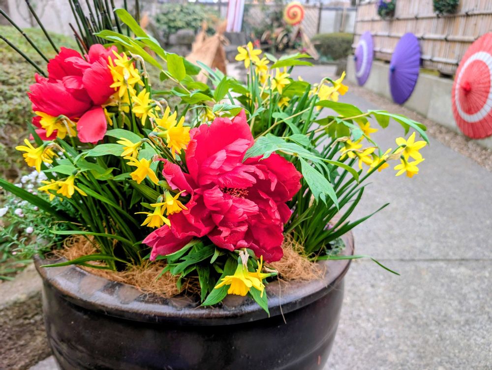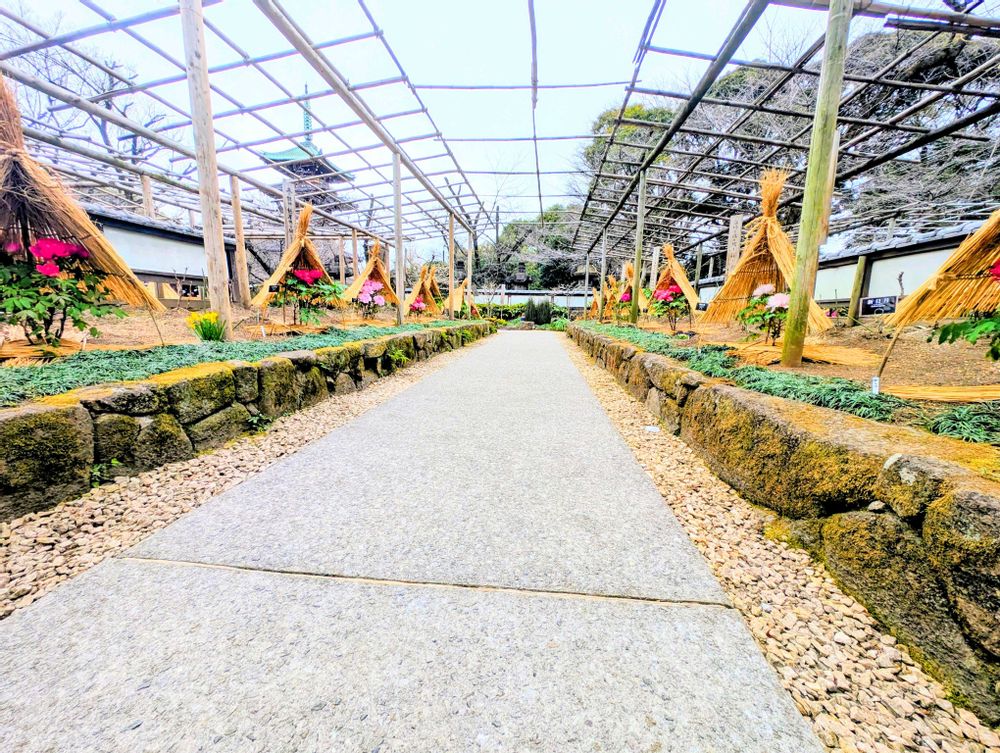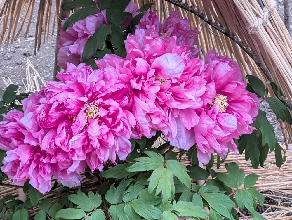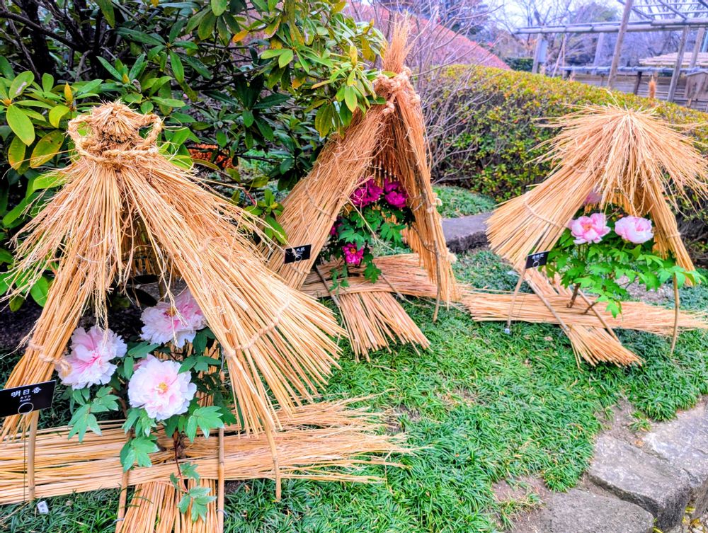 春咲きの牡丹を特別な栽培方法で咲かせています。「わらぼっち」という寒さよけがされていて面白かったです。