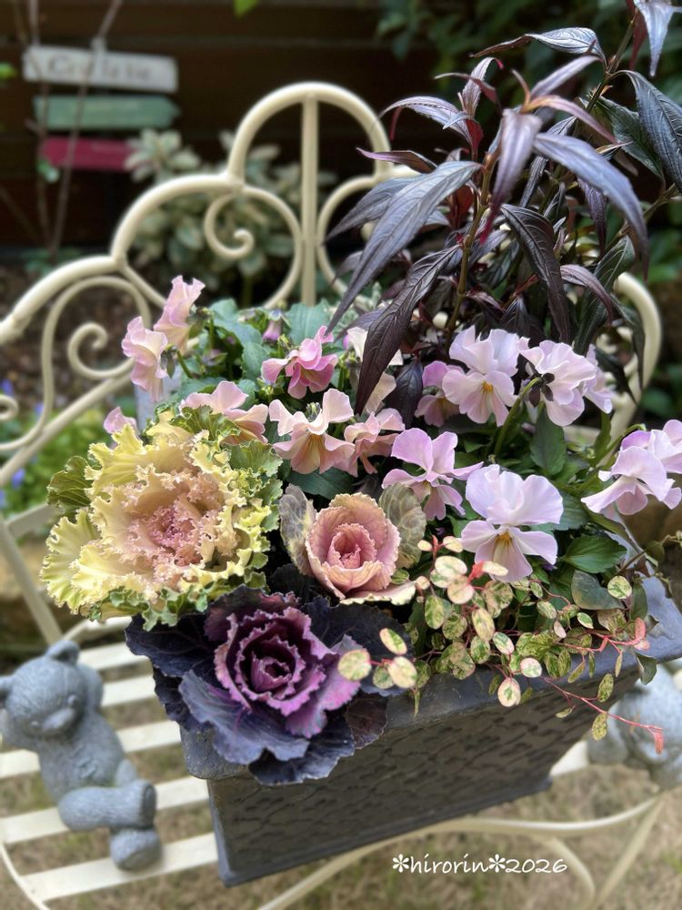 もうひとつ同じ葉牡丹に合わせたのはパスフリ桜貝というビオラ、伸びすぎずまとまって咲きもう出来上がった感じに✨