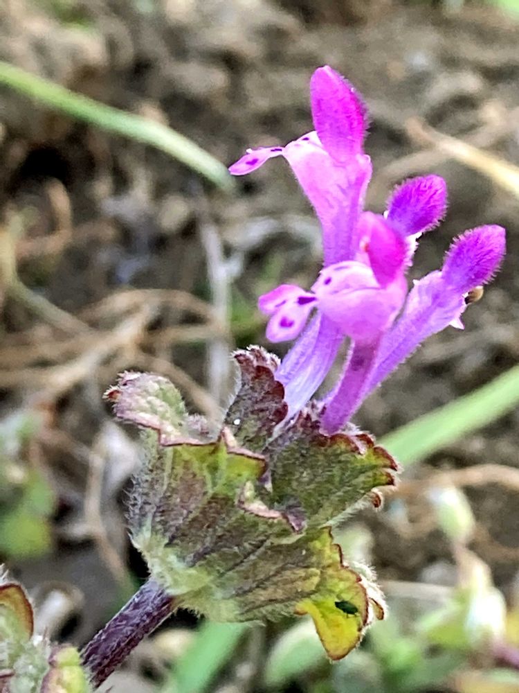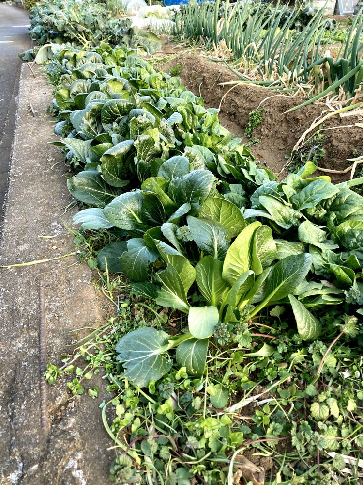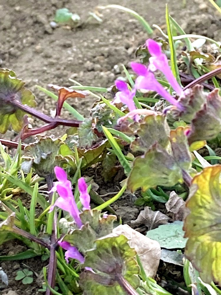 道沿いの畑。自家用?の野菜が色々育っています。傍らにはホトケノザが咲いていました。