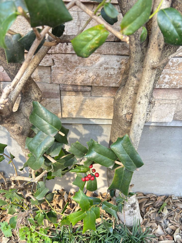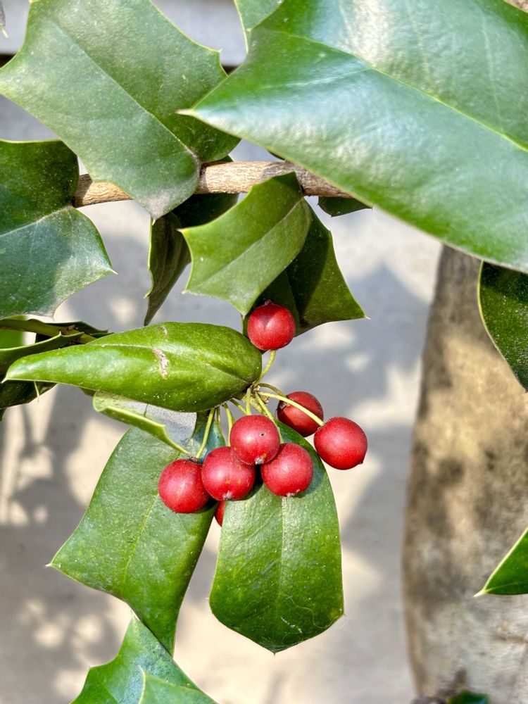 クリスマスホーリーなんか懐かしい名前です。クリスマスに赤い実になるのを探してたらちょっととんがった葉っぱ🌱と赤い実がきれいな子ですね。