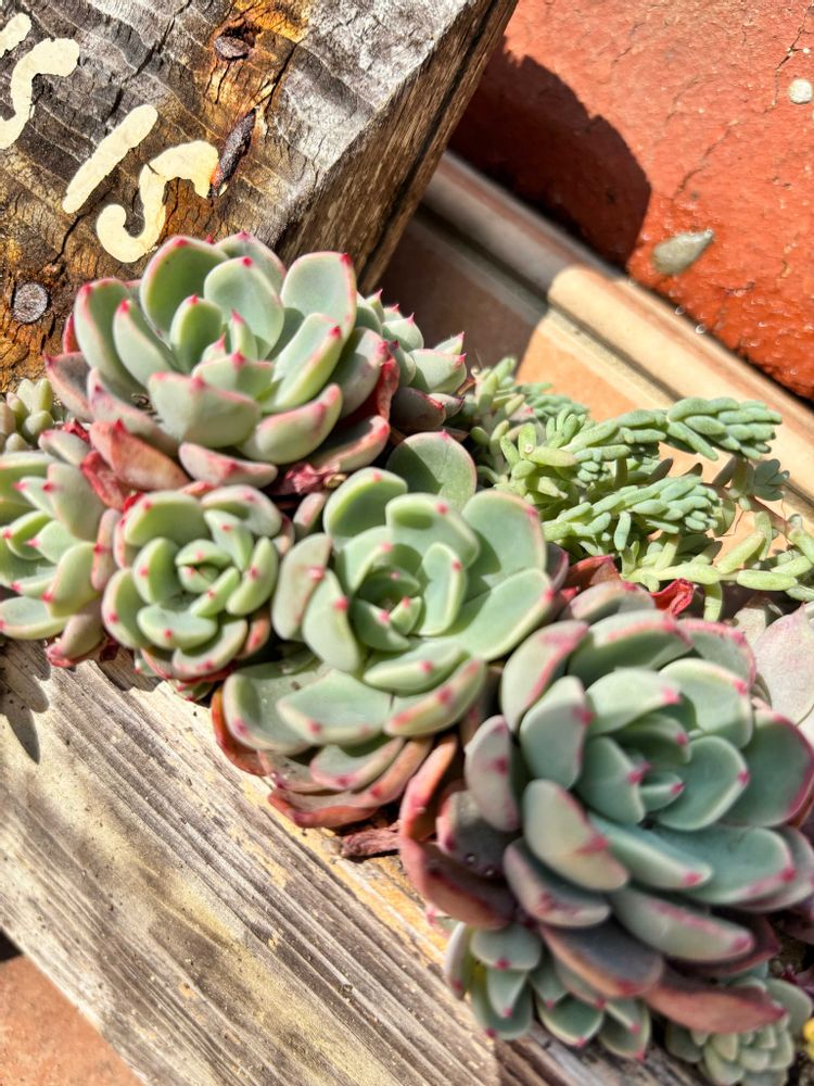 七福美尻さん。よく増えてくれる品種ですね、子株をたくさんつけてくれます😊少し大きくなった子株ちゃん達✂️して、いろんなとこに植えてます(´∀`)葉挿しはしたことないなぁ🤔。ツンとした葉先が赤くなってるのが可愛い🤩