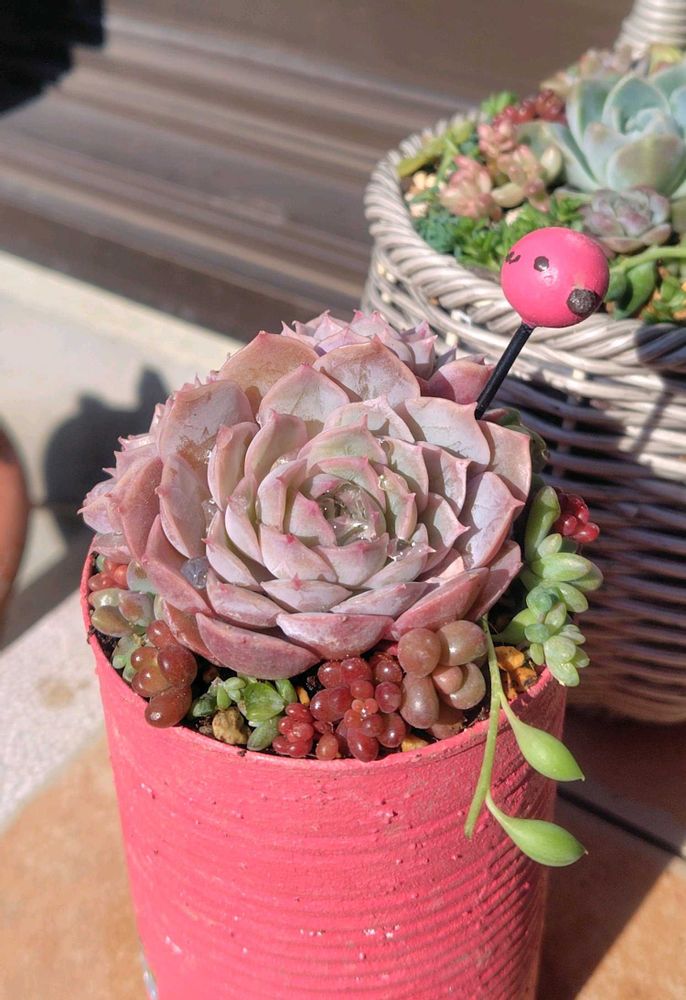 ①②🍓イベントのお店で出会ったオウンスロー🩷さんとリメ缶で、🍓カラーの寄せ植えを。