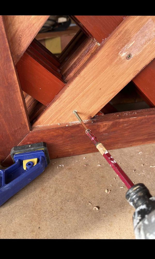 続きです😊 反対側からも部材を積み上げていきます(1〜3枚目)。補強の為、長いビスを打ち込みます(4枚目)。更に圧着(5枚目)←ほぼ完成に近い形です😊
