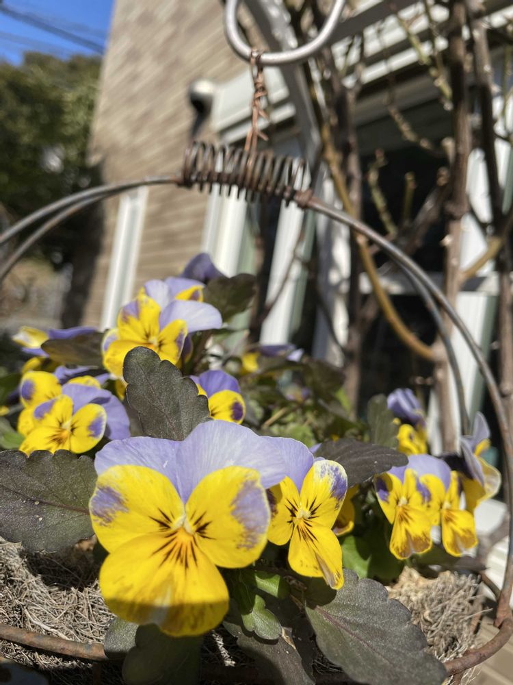 アーチに下げたビオラが居間の窓からいつも眺められて可愛い😍