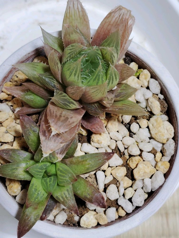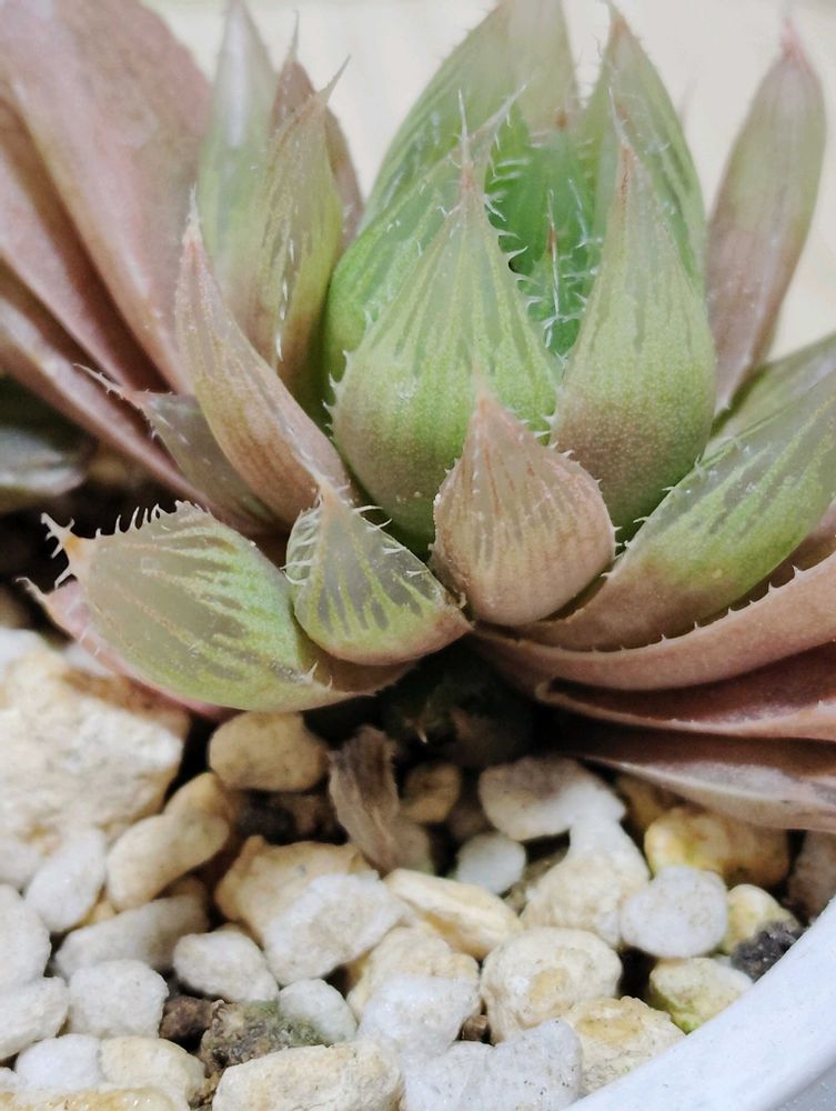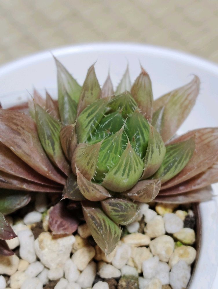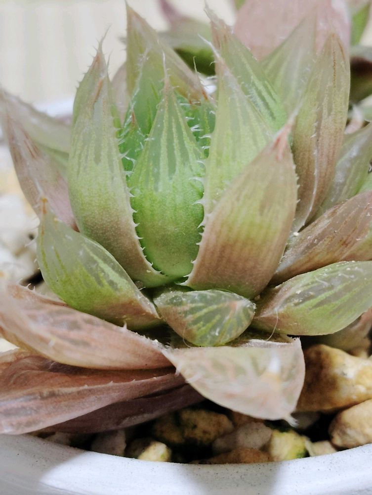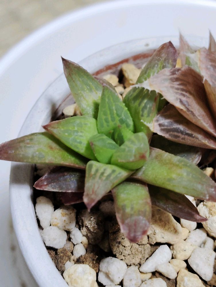 最後までベランダで直射日光にあたって頑張っていた子。外に良い置き場が無いのでハオルチアは室内に入れるか…と3日ほど前に室内へ。翌日から薄っすら緑が戻ってきました。早いなぁ。