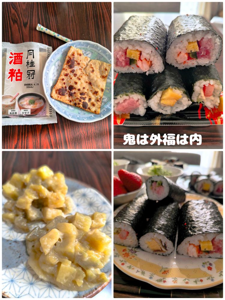 毎年作ってお友達数人に 家族分配るのですが 今年はぎっくり腰で 買い物にも行けなかったし 私の恵方巻きは野の三つ葉入りなので 三つ葉も前日までに摘んでおかなくてはいけないのに それもできなかったので 今年は無しです 😅😂🤣