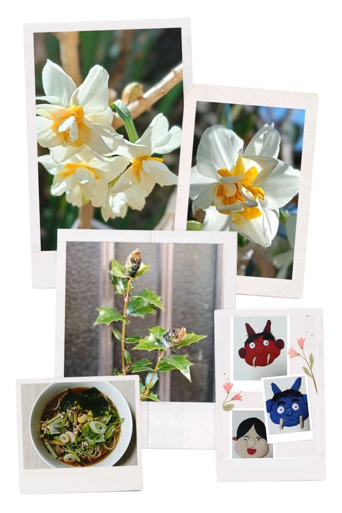 (水仙、柊鰯、節分そば〈秘伝豆入り〉、母の手作り押絵)
