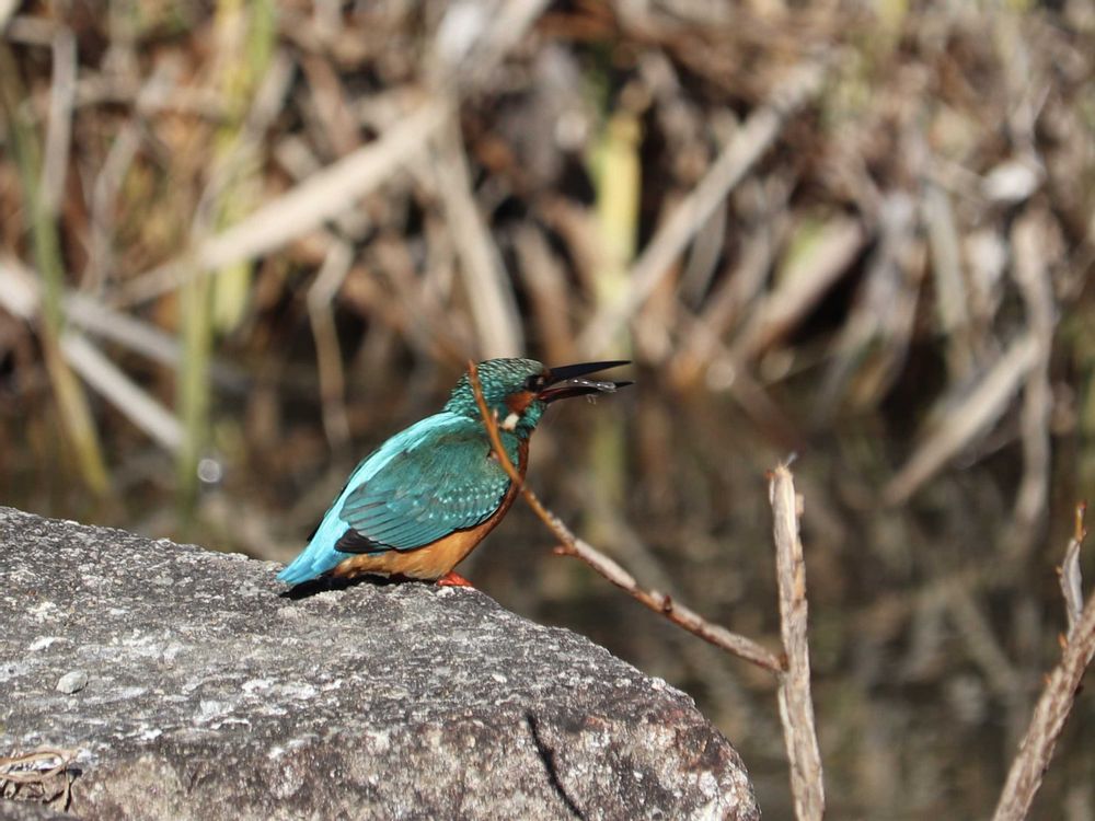 ④メジロさんは警戒して近付いてくれない中、遠くでカワセミ氏が狩りをしていて、亀が眺めていた🤭