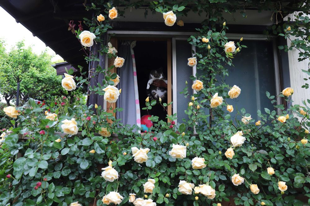 大型のつるバラ「つるレディヒリンドン」を額縁の形に沿って誘引しています✨