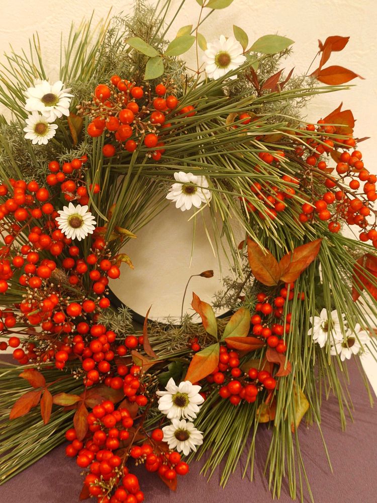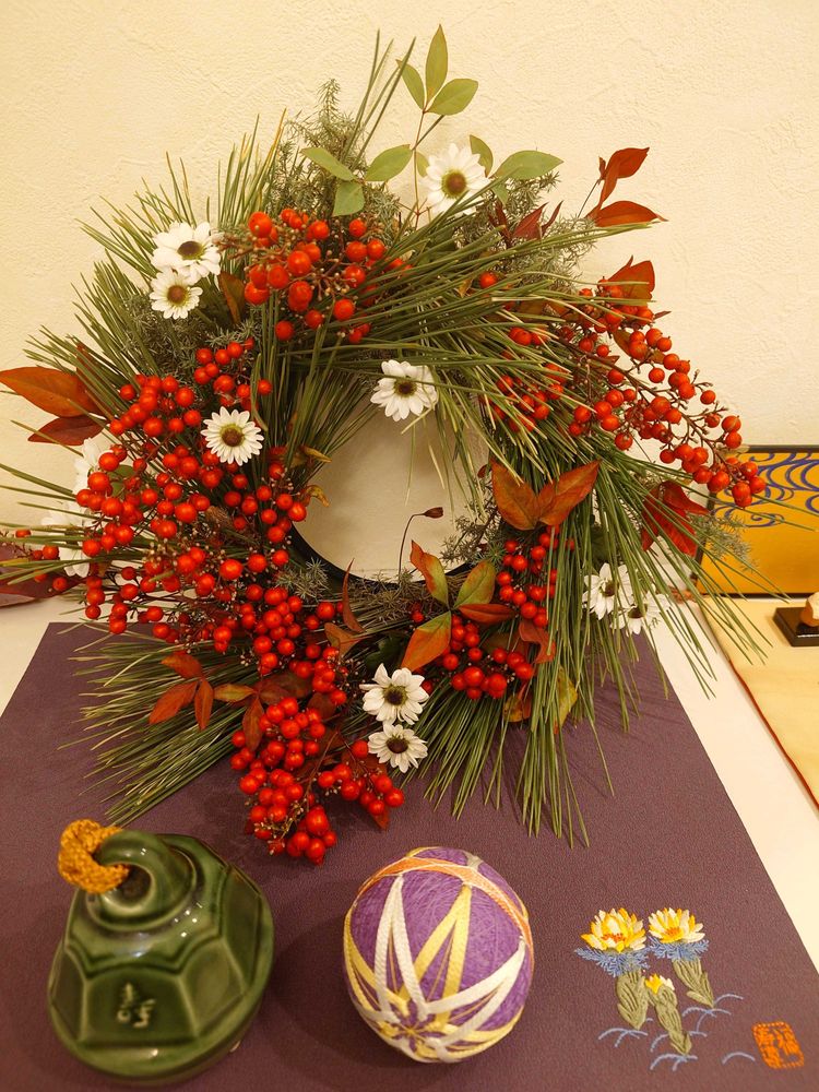 白い花は浄化を意味するので、カリカリになってしまった南天の葉の変わりに白い菊を加えました🤍