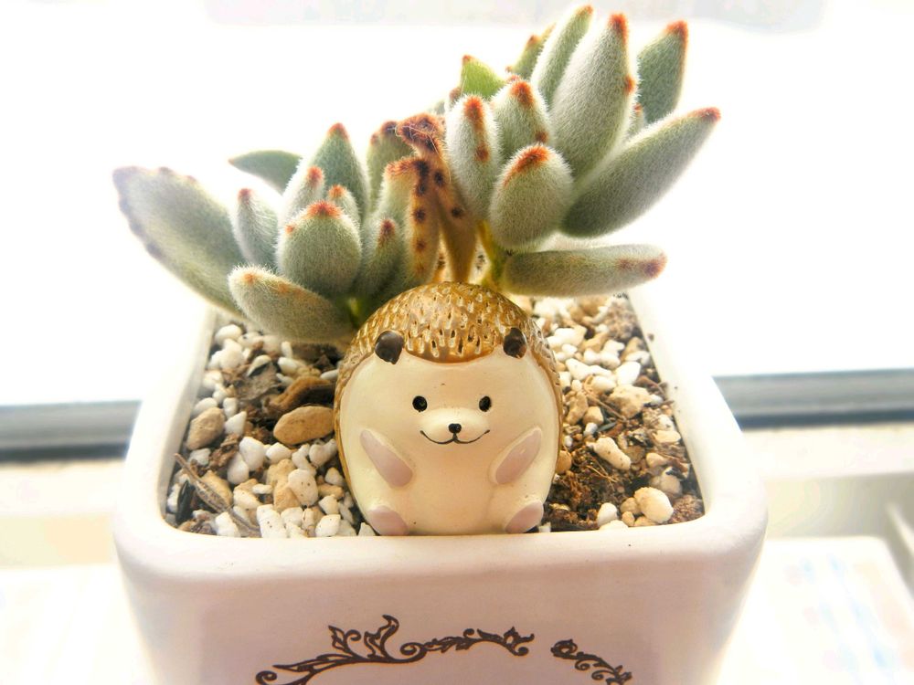 水やらなすぎで下葉がすっかり落ちてしまったところを、ハリネズミさんでうまいこと隠して😅