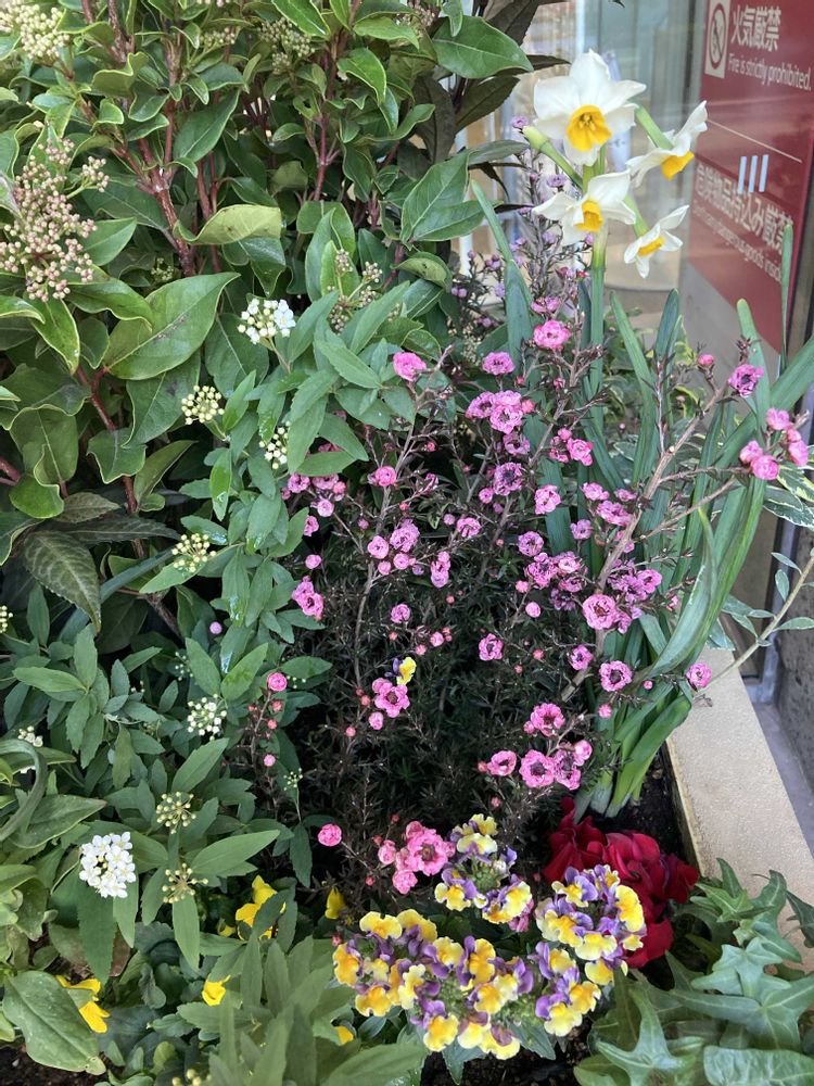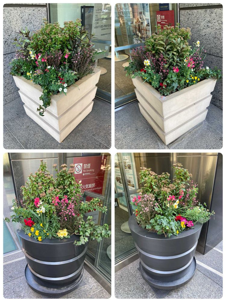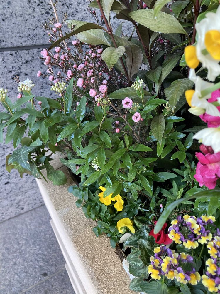 "丸ビル"の入口に飾られた鉢植えの寄植え迎花。