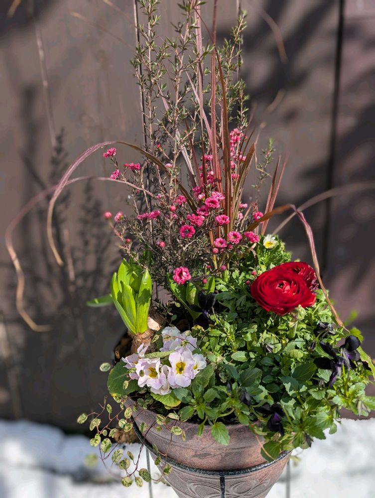 ①②③④寄せ植え(ギョリュウバイ パープルグラス ラナンキュラス ジュリアン ヒヤシンス クロビオラ等)