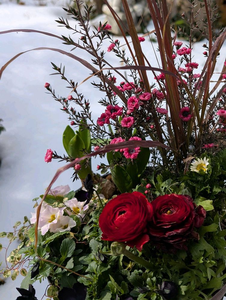 今日は雪ばかりなのでギョリュウバイと暖かそうな寄せ植えにしてみました