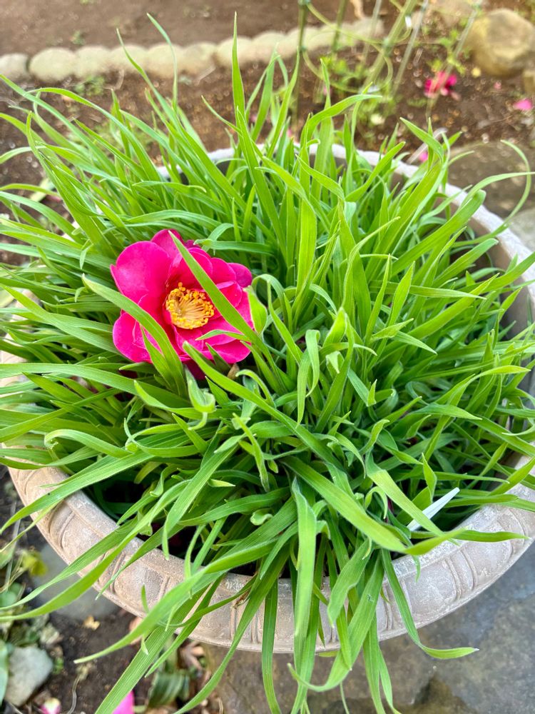 サザンカの木の下にラグラスバニーテールの種まきの鉢を置いてたのですが、なんとそこに芸術的🎨な光景が‼️(大袈裟💦)