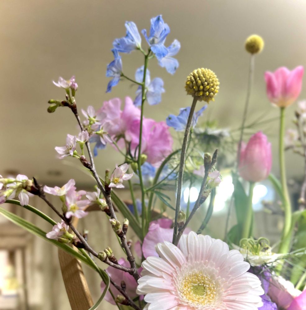 ピンクのスィートピー、チューリップ、黄色のクラスペディア、青いデルフィニュム‥