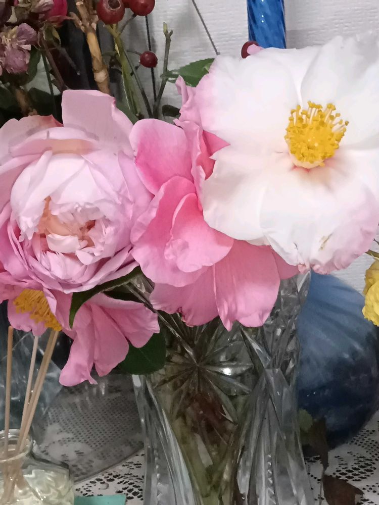 ③薔薇ソニアリキエル、椿玄関に飾っています〜薔薇の良い香りがします✨️🩷