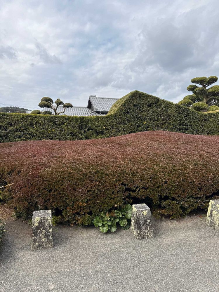 石組みの一つもない大刈込み一式の庭園です。連山を表現するイヌマキによる生と、新画に