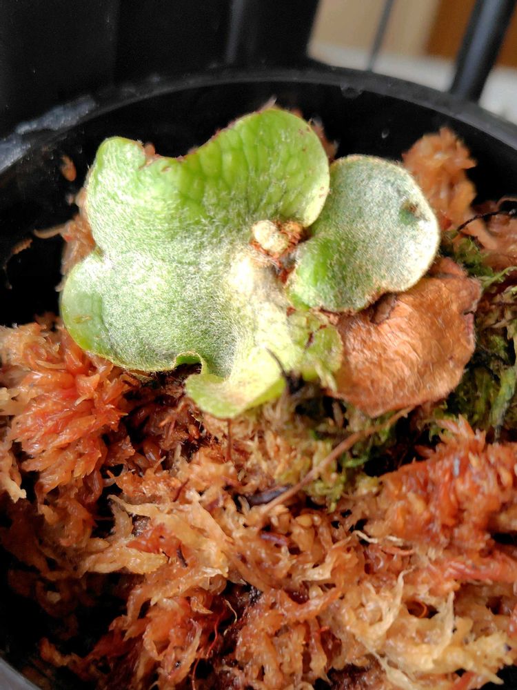 パリパリになった新芽の下の水苔ごと、ハサミで切り取り。