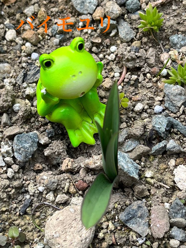 ①新人のまったり🐸さん。和み♪さんのプレゼント企画で当選していただきました。今日の花、バイモユリの🌱だと思う子見つめています。