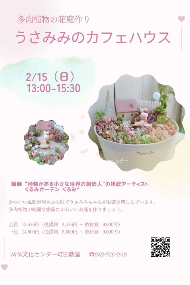 🩷くるみガーデンミュージアムin横浜 (JR京浜東北線 根岸駅) ※入場料1000円でお茶とお菓子付き🍵🍪 植物や作品の見学、お買い物やワークショップできます。 完全予約制(住所非公開) ※InstagramのDM、くるみガーデンのメール(kurumi_garden@outlook.jp)からミュージアムの予約出来ます ※定員1〜4名まで ワークショップ2/15に町田でやったものと同じうさみみの多肉箱庭(豪華フルセット版)も作れます(13000税込)2.5時間 ※サボテンでも作れます 🔰全くの初めてさん向け基本ワーク ワークショップ(材料費込) サボテン手のひらガーデン4000 (ハウス、フェンス、小物付き) リスさん、小鳥さん4000 Mサイズの鉢の寄せ植え サボテンの木馬寄せ植え🎠 6000 大きなクマさん寄せ植え6000 多肉orサボテンの箱庭6000 Lサイズの鉢の多肉orサボテン寄せ植え(ケーキ型🎂) 大きなサボテン箱庭 10000 (ハウス、フェンス、小物付き10000 森の大きな木の食器棚作り 12000 (初回のみ+1000材料費かかります) 🔴2024.4 フジテレビ めざましテレビ 『キラビト』出演 📕出版書籍 主婦の友社より 『多肉植物とドライフラワーのミニチュアガーデン』(第3刷) くるみガーデン くるみ* ※くるみガーデン•オンラインショップではサイン本の購入ができ、オリジナルしおり🔖のオマケ付き❣️ 🔴YouTube 、X(Twitter)、Instagramやってます 登録してもらえると嬉しいです😊 🔴『くるみガーデン』オンラインショップでは、サボテン、用土、お家、小物、ピック、寄せ植え、など購入できます 🔴Instagram、on-lineShop、WS ↓↓↓↓↓↓↓↓↓