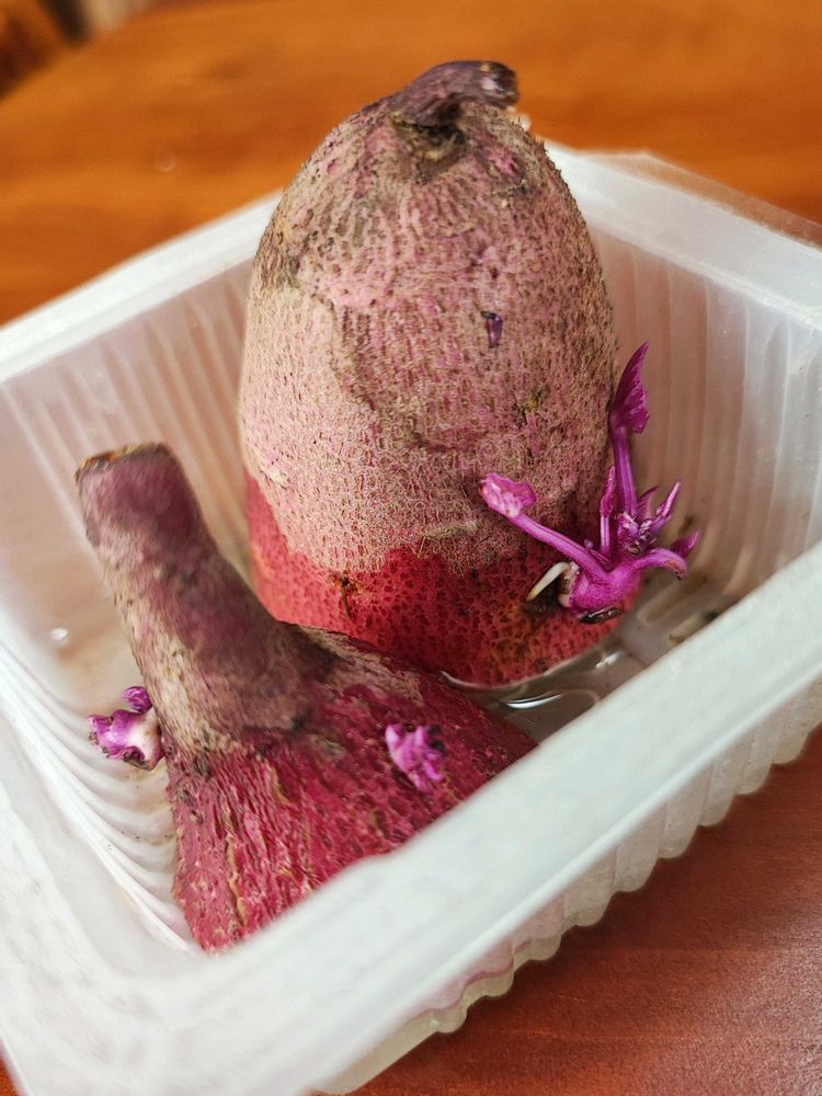 9月に一旦掘りあげたものの芋が小さくてまたすぐ埋め戻して、12月直前になってから収穫したサツマイモの紅はるか、そろそろ食わなんって昨日オカンが茹でようとしていてたので、芽が出てるところだけカットして回収しました。外のガレージにも鉢植えで残してる(ギリギリ生きてるっぽい)し、小さい芋も保管してありますが、芽&根が上手いこと出てるので土に埋めてポット苗にしときます。