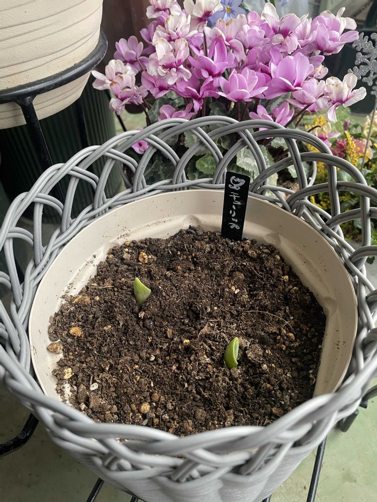 4️⃣パンジーの端っこに植えたシラーも、ぴょこっとかわいい芽が出てきました♪