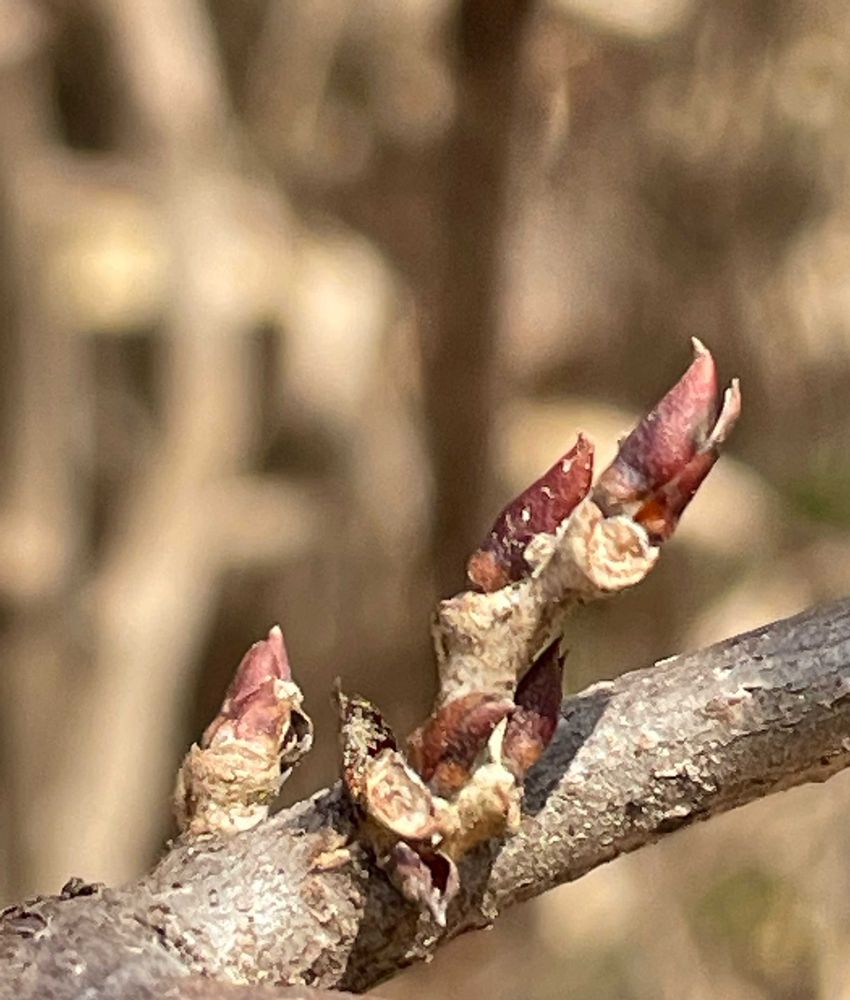 見た目の特徴 : フジの冬芽は、長さ5~8mmほどの長卵形で紫褐色を帯びた2~3個の芽鱗に包まれています。