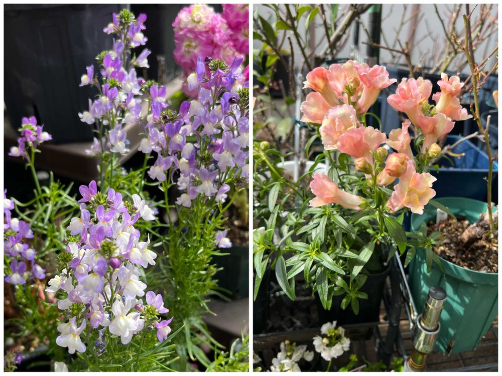 アネモネも開花苗が出まわるようになりましたね。レバンテビアンコは切花品種で、しっかりした太い茎に大輪の花を咲かせています。去年から育てているリナリアや金魚草も充実してきました😄綺麗です。