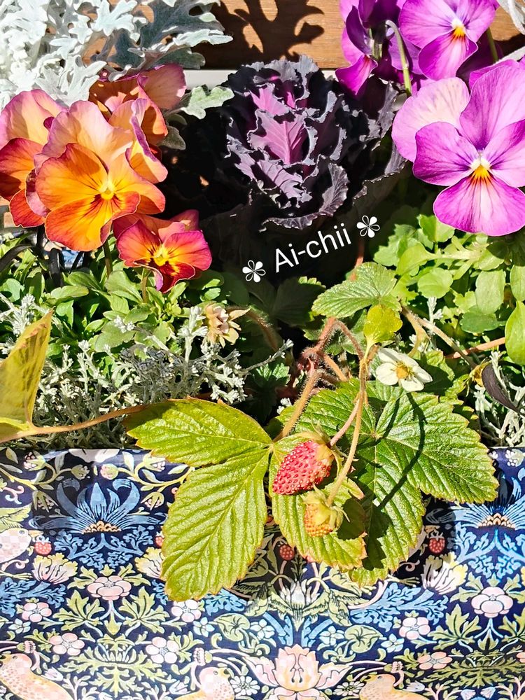 いちご泥棒の寄せ植えです🍓🐦️