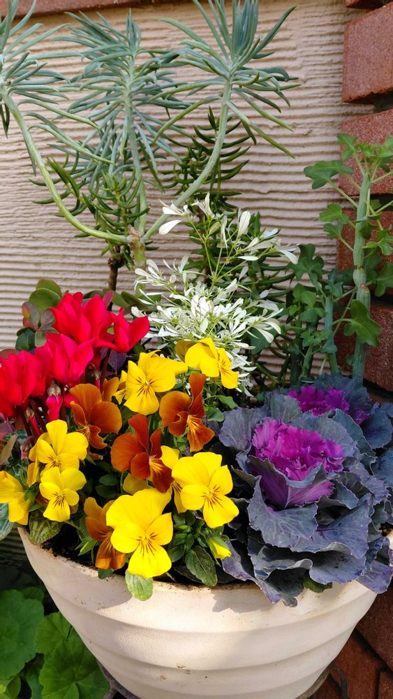 鉢の中のなが~い先住植物に、季節ごと新入り植物を足し楽しんでいます😁