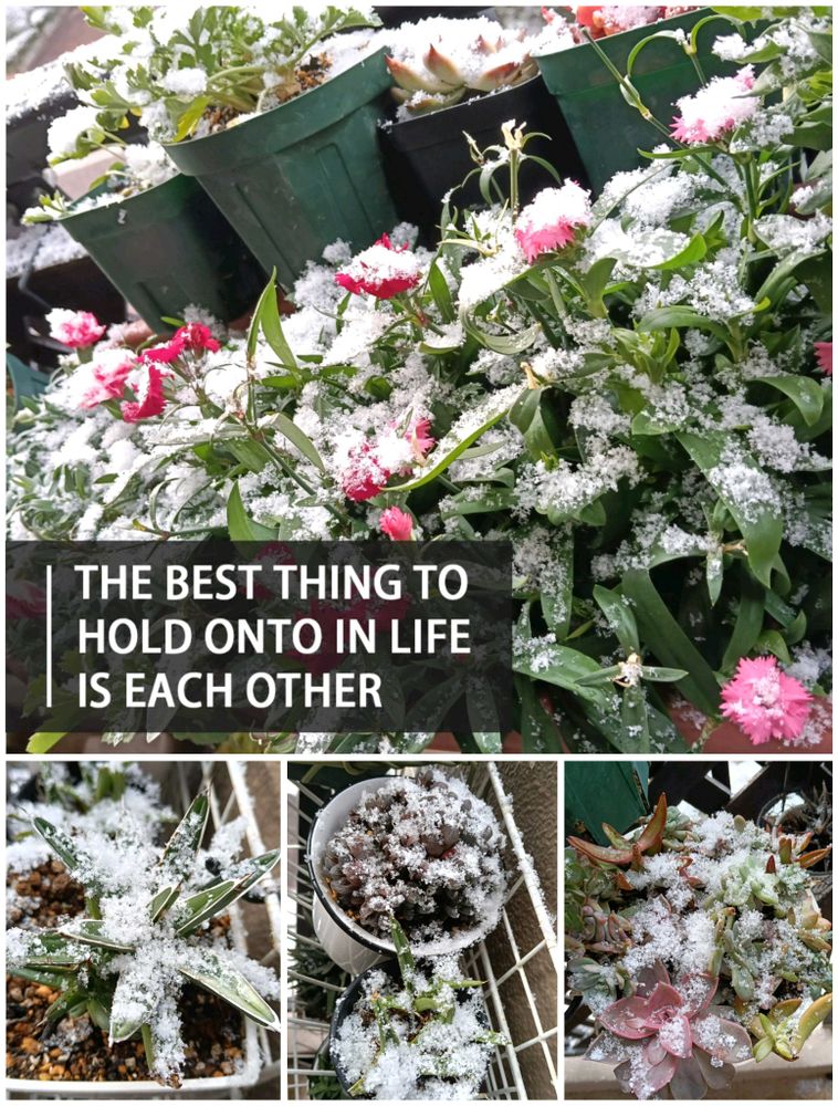 朝起きたらベランダの鉢植えにもうっすら積雪が…