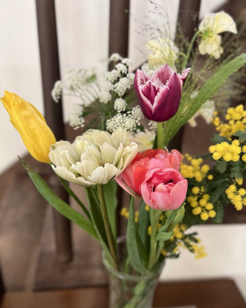 チューリップ&ミモザって春のワクワクだらけのアレンジですね〜(((o(*゚▽゚*)o)))