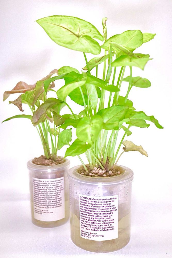 綿棒の容器を加工して作った底面給水ポットに去年5月に入れ育った現在のシンゴニウムの姿が3枚目写真…綿棒の容器捨てるのは勿体無い!