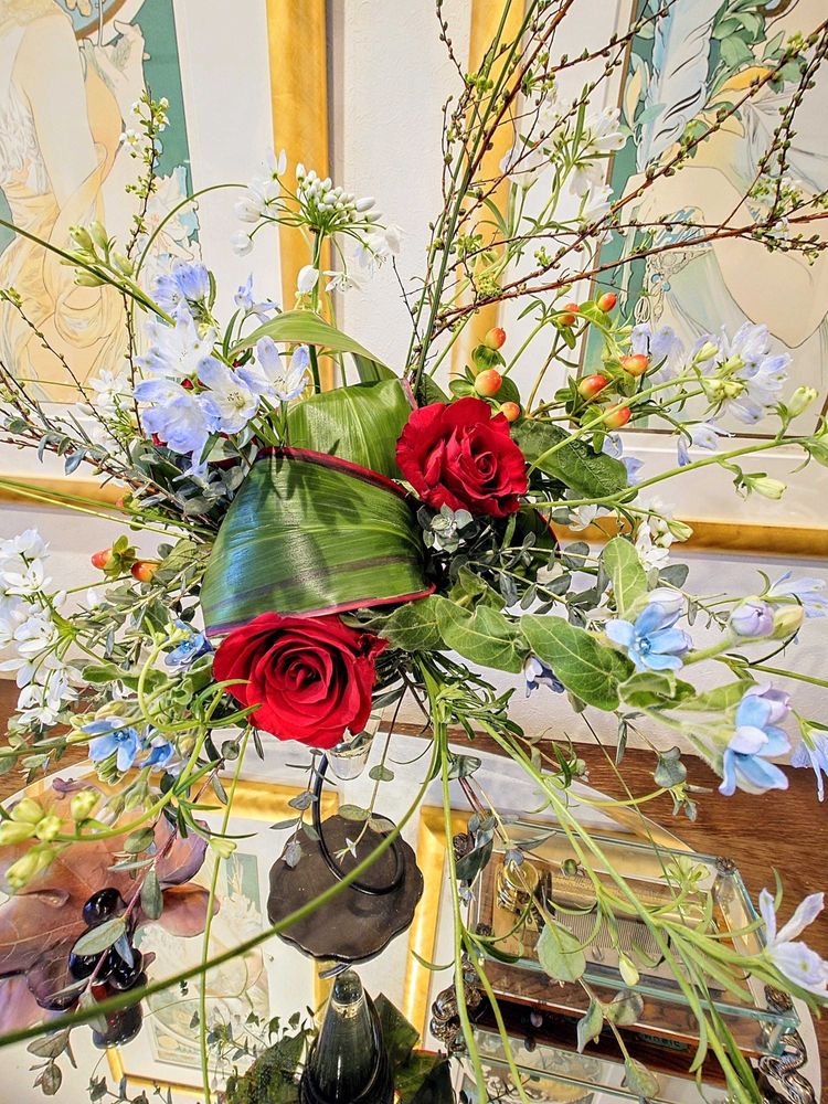 のびのびユキヤナギ、スチールグラスの流れが素敵💕赤🌹、デルフィニウム、ブルースターが映えるアレンジですネ💕