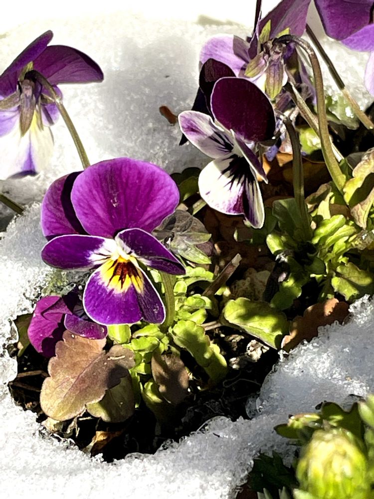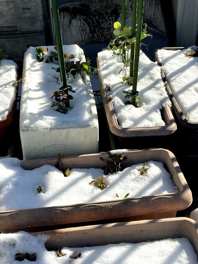 昨日の雪に埋もれたお花たち、今朝も元気です