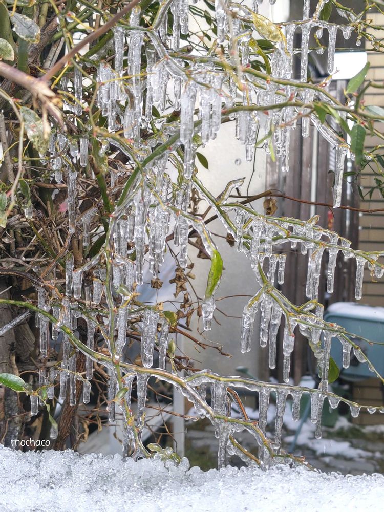 午後に出掛けるために外に出るとモッコウバラの枝に氷柱が😳氷のシャンデリアのよう💎