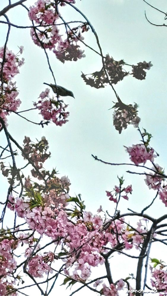 青空の下でメジロさんと川津桜を綺麗に撮れたらいいな〜・:*:・(*˘︶˘*).。*♡・:*:・♩