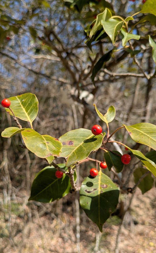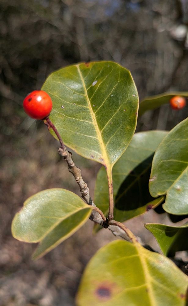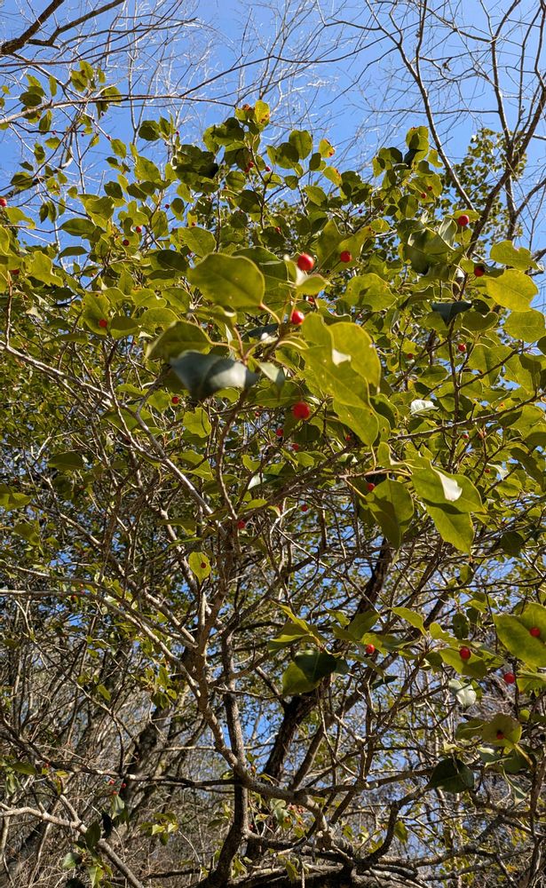 長い柄をもった赤い実は目立つけれど、鳥たちの食事は後まわしになるのか、冬の終わりまで長く残っている🔴
