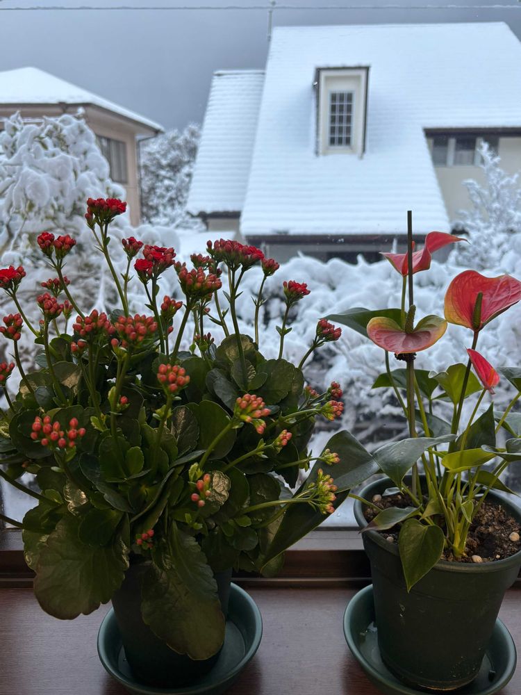 紅い室内のお花達と外の雪景色。お部屋がポカポカと暖かそう。